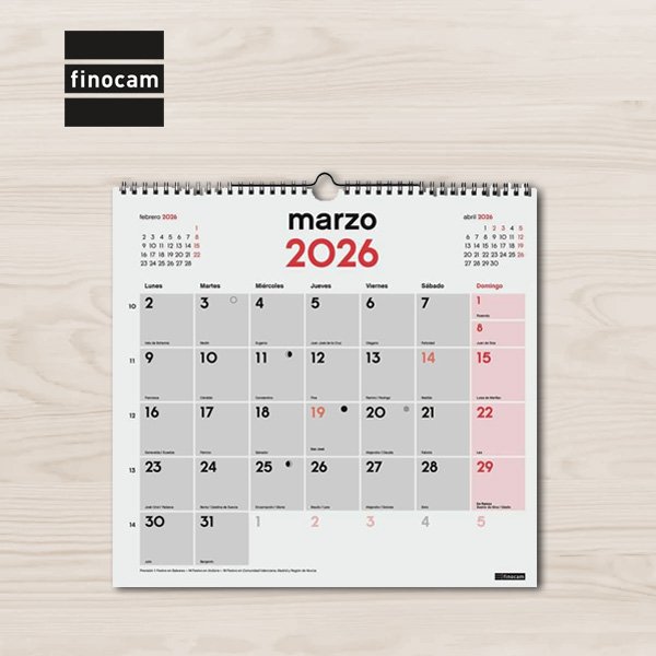 - Interior: Mes Vista. Para planificarse a nivel mensual. Con información de los festivos de España. La anualidad del calendario incluye la información relativa a: festivos internacionales, fases lunares y cambios de estación.
